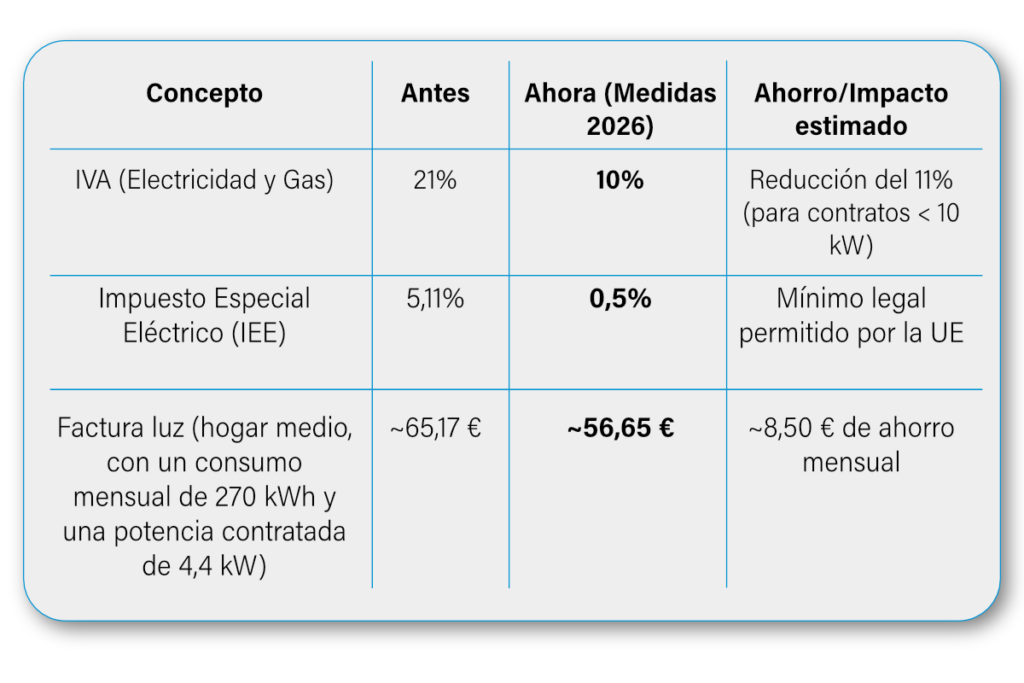 • Reducción del impuesto especial eléctrico: baja del 5,11% al 0,5%, el mínimo permitido por la normativa europea.