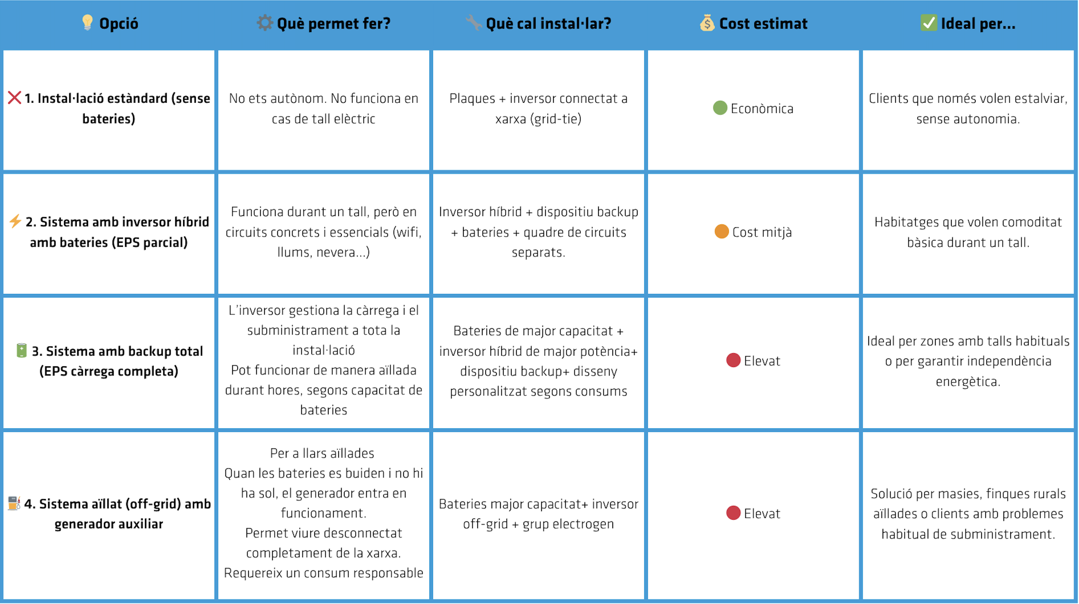 Una altra alternativa, més completa, per garantir subministrament elèctric en qualsevol situació i tenir una autèntica independència energètica, és el sistema amb backup total. En aquest cas, tota la casa o negoci pot continuar funcionant amb energia solar i bateries, sense dependre de la xarxa elèctrica. L’inversor híbrid intel·ligent gestiona automàticament la càrrega i el subministrament, permetent que la instal·lació operi de forma aïllada durant hores o fins i tot dies, segons la capacitat de les bateries i els consums de l’usuari. Per fer-ho possible, cal un disseny personalitzat, bateries de gran capacitat i un sistema ben dimensionat. Per últim, existeix el sistema híbrid amb generador auxiliar.